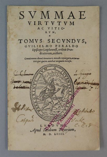 Druga knjiga tiskana davne 1554. godine nosi naslov Summa virtvtvm ac vitiorvm: Tomvs secvndvs autora Guillelmusa Peraldusa. Riječ je o glasovitom srednjovjekovnom propovjedniku i piscu, koji je prema dostupnim podacima živio od cca 1190-1271. godine. Peraldus, Francuz porijeklom, dominikanac, studirao je na Sorbonni i najveći dio svoga života proveo u Lyonu. Djelo koje posjeduje naša knjižnica najvažnije je i najpoznatije djelo iz njegova opusa.